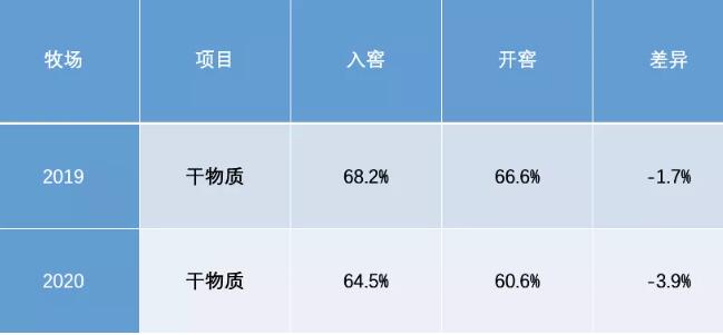 圖7所示為安徽一個(gè)牧場(chǎng)2019年和2020年兩年所做高濕玉米的差異。2019年入窖的高濕玉米干物質(zhì)68%、水分32%,開窖之后干物質(zhì)66.6%,下降1.7%,損耗較小。2020年由于各種客觀條件,入窖時(shí)干物質(zhì)只有64.5%,開窖之后下降到60.6%,損失3.9%,損失較大。