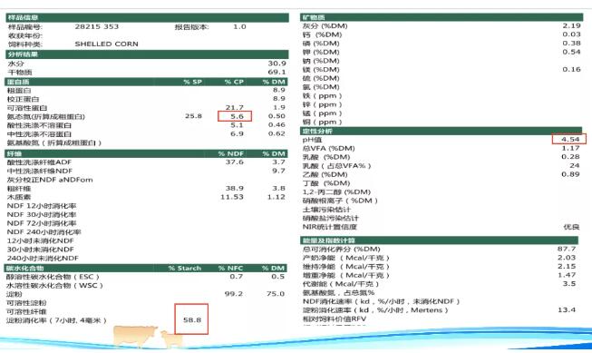 第二,要通過(guò)監(jiān)控pH值掌握發(fā)酵是否充分,pH值4.5,略高。然而,大家可以從圖6中看出,氨態(tài)氮含量和pH值這兩個(gè)指標(biāo)非常好的情況下,淀粉消化率反而不高,只有58.8%。前面圖2氨態(tài)氮達(dá)到5%左右時(shí),瘤胃7小時(shí)淀粉消化率能達(dá)到72%,這么大的差異是什么原因造成的呢?除了取樣誤差或者檢測(cè)誤差,跟品種、玉米粉碎細(xì)度都有關(guān)系,可能碾壓的玉米粉碎較粗,影響未來(lái)淀粉消化率。總之,這些指標(biāo)要綜合對(duì)比,并不是氨態(tài)氮夠了淀粉消化率就夠了這么簡(jiǎn)單。