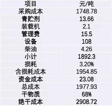 應(yīng)該估算未來(lái)它的使用成本是多少,跟玉米顆粒、壓片玉米相比,價(jià)格差異較大或是不劃算就不要做了。圖4所示是某場(chǎng)高濕玉米成本核算,當(dāng)時(shí)采購(gòu)的濕玉米,成本1748元;青貯劑、裝載機(jī)、管理費(fèi)、租用的加工設(shè)備、柴油費(fèi)用等合計(jì)約140-150元,這些項(xiàng)成本約1890元(1750元+140元);這個(gè)場(chǎng)損耗3.2%,還算不錯(cuò),含損耗成本是1954元;成本核算還須考慮資金成本,每次做三五千噸高濕玉米,3個(gè)月制作周期占用的資金成本約合23元;所有這些加起來(lái)即為玉米的總成本,約1977元。按高濕玉米干物質(zhì)含量68%計(jì)算,每噸高濕玉米最終的使用成本約2908元。