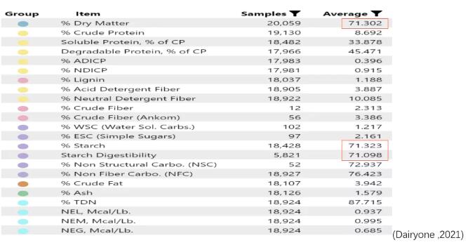美國(guó)高濕玉米水平可從圖1 DairyOne實(shí)驗(yàn)室數(shù)據(jù)看出。2004年到2021年,DairyOne實(shí)驗(yàn)室一共檢測(cè)了大概2萬(wàn)個(gè)高濕玉米樣品,2萬(wàn)個(gè)數(shù)據(jù)平均下來(lái),干物質(zhì)、淀粉含量、淀粉消化率(指7小時(shí)瘤胃體外消化率)都在71%左右。