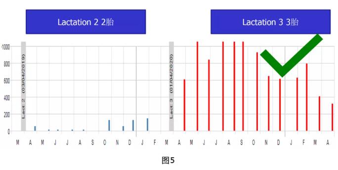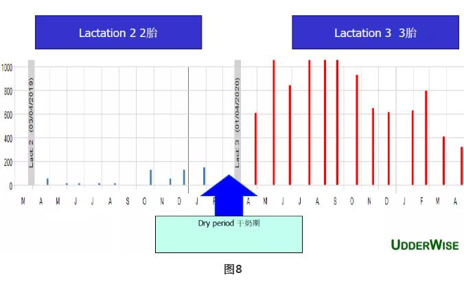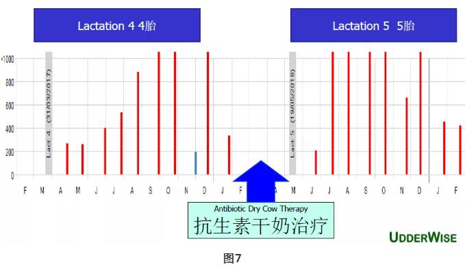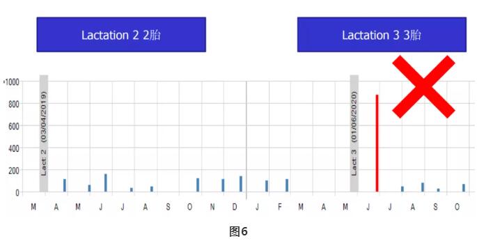 圖7所示為某母牛四胎和五胎體細胞計數(shù)??梢钥吹剑奶r紅色柱狀為10個DHIA檢測結(jié)果,其中9個體細胞計數(shù)都超過20萬,也就是說它有慢性亞臨床乳房炎,在4胎末期使用了干奶藥進行治療,然后產(chǎn)犢;五胎時,體細胞計數(shù)仍然非常高。所以該母牛在本泌乳期以及上個泌乳期都有亞臨床乳房炎,干奶治療失敗,我們可以考慮淘汰。