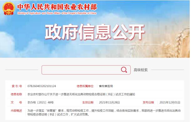 為進(jìn)一步落實(shí)“放管服”要求,規(guī)范動(dòng)物檢疫工作,提升檢疫工作效能,農(nóng)業(yè)農(nóng)村部決定進(jìn)一步推進(jìn)無(wú)紙化出具動(dòng)物檢疫合格證明(B證)試點(diǎn)工作,擴(kuò)大試點(diǎn)范圍。