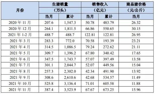 正虹科技公告也顯示,2021年11月公司銷售生豬 3.92萬頭,銷售收入6998.91萬元,環(huán)比分別增長4.39%、15.86%;同比分別增長270.96%、76.74%;
