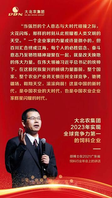 邵博士表示,廣東是全球飼料產(chǎn)業(yè)最強勁的區(qū)域,大北農(nóng)廣東事業(yè)已全面升級為乾勝發(fā)展集團,下轄大北農(nóng)事業(yè)部、綠色巨農(nóng)事業(yè)部、養(yǎng)豬事業(yè)部、貿(mào)易事業(yè)部、投資事業(yè)部,將繼續(xù)開創(chuàng)新的事業(yè)篇章。未來計劃投資20億,建造占地300畝,年產(chǎn)300萬噸的全球最大最綜合的飼料產(chǎn)業(yè)園,并成立大北農(nóng)投資基金,聯(lián)手各大高校、科研機構(gòu)、行業(yè)同仁以及有夢想的創(chuàng)業(yè)伙伴攜手共進、共襄盛舉。