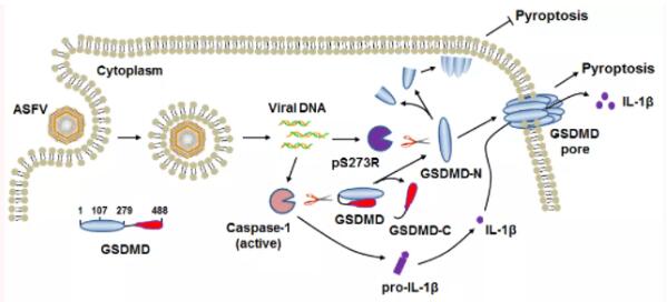 本研究發(fā)現(xiàn)ASFV編碼的一種半胱氨酸蛋白酶pS273R能夠結(jié)合細(xì)胞焦亡的執(zhí)行蛋白Gasdermin D (GSDMD)。進(jìn)一步的研究表明,ASFV pS273R依賴(lài)其酶活性特異性切割GSDMD的G107-A108位點(diǎn),產(chǎn)生一個(gè)較短的GSDMD 氨基端片段(GSDMD-N1-107)。該片段與宿主細(xì)胞Caspase-1切割GSDMD產(chǎn)生的氨基端片段(GSDMD-N1-279)明顯不同,進(jìn)一步研究發(fā)現(xiàn),pS273R切割了GSDMD-N1-279, 所產(chǎn)生的GSDMD-N1-107和GSDMD-N107-279均不觸發(fā)細(xì)胞焦亡,揭示ASFV pS273R蛋白夠通過(guò)切割GSDMD阻礙細(xì)胞焦亡的發(fā)生,從而有利于病毒在宿主細(xì)胞內(nèi)完成復(fù)制。該研究成果揭示了pS273R在炎癥反應(yīng)和ASFV復(fù)制中的重要功能,發(fā)現(xiàn)了ASFV免疫逃逸的一種新機(jī)制,為ASFV的防控研究提供了一個(gè)新的藥物靶點(diǎn)。