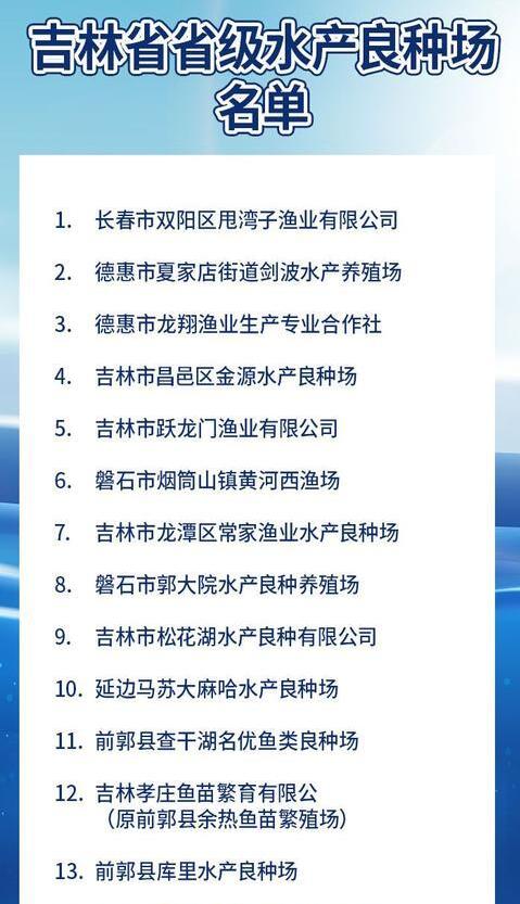 在水產(chǎn)良種生產(chǎn)單位申請(qǐng)和各級(jí)漁業(yè)行政主管部門審核推薦基礎(chǔ)上,吉林省農(nóng)業(yè)農(nóng)村廳組織有關(guān)單位進(jìn)行了現(xiàn)場(chǎng)核查和全面考核評(píng)估,現(xiàn)將吉林省省級(jí)水產(chǎn)良種場(chǎng)名單予以公示,共有34家單位榜上有名!