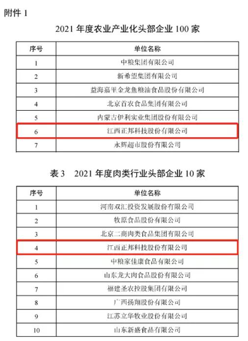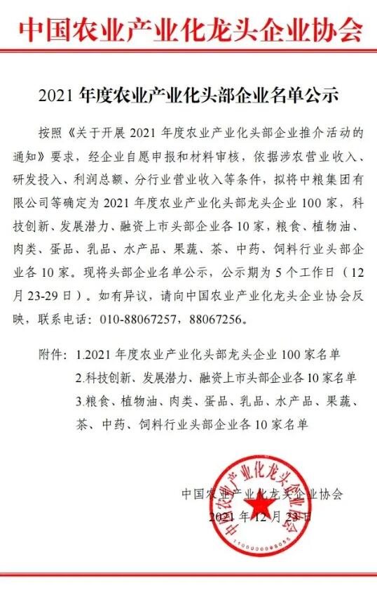 經(jīng)企業(yè)自愿申報(bào)和材料審核,依據(jù)涉農(nóng)營業(yè)收入、科研投入、利潤總額、分行業(yè)營業(yè)收入等條件,12月23日,中國農(nóng)業(yè)產(chǎn)業(yè)化龍頭企業(yè)協(xié)會(huì)發(fā)布了2021年度農(nóng)業(yè)產(chǎn)業(yè)化龍頭企業(yè)名單。正邦科技分別位列2021年度農(nóng)業(yè)產(chǎn)業(yè)化頭部企業(yè)100家第6位、2021年度肉類行業(yè)頭部企業(yè)10家第4位、2021年度飼料行業(yè)頭部企業(yè)10家第7位。