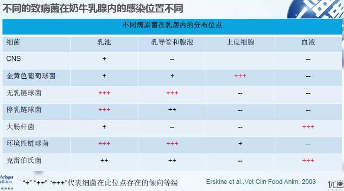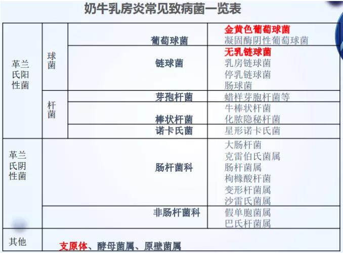 圖中標(biāo)紅的是目前大家普遍認(rèn)同的三種傳染性致病菌,即金黃色葡萄球菌、無乳鏈球菌以及支原體,除了這三種致病菌,其它乳房炎致病菌目前都?xì)w類為環(huán)境性致病菌。
