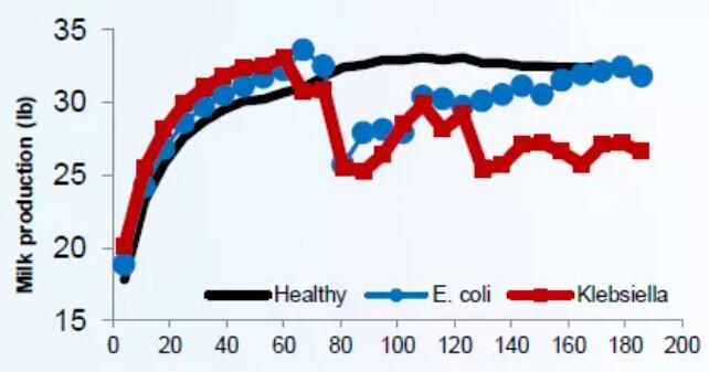 革蘭氏陰性菌更容易導(dǎo)致臨床性乳房炎,癥狀的嚴(yán)重程度取決于內(nèi)毒素的釋放情況。另外,不同的革蘭氏陰性菌抗生素治療治愈率有明顯差異。比如大腸桿菌使用抗生素治療可能有明顯改善,但克雷伯氏菌治愈率比較低,尤其細(xì)菌學(xué)治愈率相對較低。由于革蘭氏陰性菌釋放內(nèi)毒素會導(dǎo)致更嚴(yán)重的炎癥反應(yīng)。所以,在治療層面上要重視炎癥的控制。如果牧場革蘭氏陰性菌發(fā)病率高,防控重點(diǎn)主要在臥床糞污管理、擠奶前藥浴、前擦拭,因?yàn)樵谂P床和糞便中存在的病原菌量非常大。