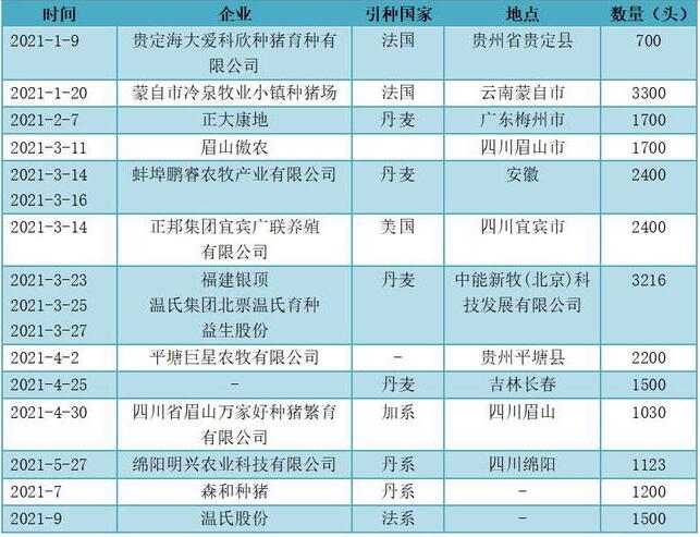 據(jù)中國(guó)飼料行業(yè)信息網(wǎng)不完全統(tǒng)計(jì),2021年截至12月16日,中國(guó)從國(guó)外引進(jìn)種豬2.4萬(wàn)頭,大部分集中在上半年,已然超過(guò)2020年的2.2萬(wàn)頭(數(shù)據(jù)截至2020年12月17日),從來(lái)源國(guó)看,來(lái)自丹麥的種豬占46%,來(lái)自法國(guó)的占23%,美國(guó)和加拿大各占10%和4%。而在2020年,我國(guó)從法國(guó)、丹麥、美國(guó)、加拿大和英國(guó)進(jìn)口的種豬分別為43%、40%、9%、5%和3%。