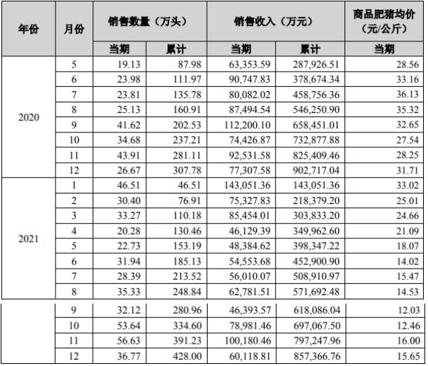 2021年1-12月銷售商品豬428.00萬頭(其中仔豬銷售59.89萬頭),銷售收入857,366.76萬元,銷售均價(jià)18.38元/公斤(商品肥豬均價(jià)為17.29元/公斤),同比變動(dòng)分別為39.06%、-5.02%、-64.29%。