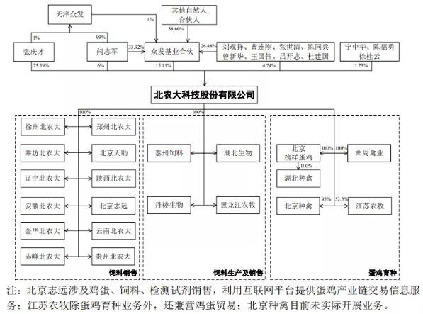 到了2012年,農(nóng)大實(shí)驗(yàn)飼料廠(后更名為北京震亞預(yù)混飼料廠)悉數(shù)轉(zhuǎn)讓了其持有的北農(nóng)大股權(quán)。而今的北農(nóng)大由張慶才直接持有73.39%的股份,同時(shí)其夫人閆志軍持股6.00%,二人還通過(guò)員工持股平臺(tái)——眾發(fā)基業(yè)間接控制公司15.11%的股份,為北農(nóng)大的共同實(shí)際控制人(合計(jì)表決權(quán)達(dá)到94.50%)。
