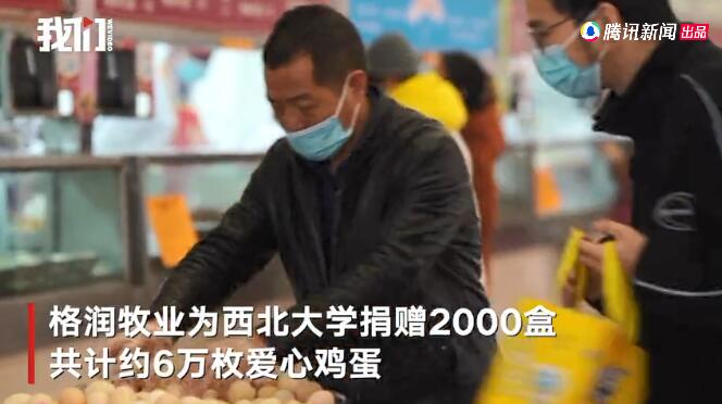 1月5日,陜西西北大學(xué)收到格潤(rùn)牧業(yè)捐贈(zèng)的2000盒共約6萬(wàn)枚愛(ài)心雞蛋,每枚雞蛋上都印有“護(hù)家園,共長(zhǎng)安”。午餐時(shí)段學(xué)校在食堂設(shè)置供給點(diǎn),為2萬(wàn)余名學(xué)生提供煮雞蛋,每名學(xué)生可免費(fèi)領(lǐng)一枚,活動(dòng)將持續(xù)至雞蛋發(fā)放完畢。