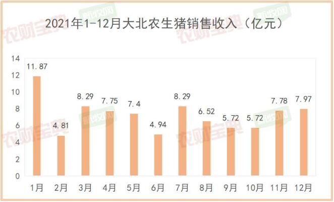 從往年數(shù)據(jù)來看,養(yǎng)豬業(yè)務是大北農(nóng)第二大收入來源。2021年,大北農(nóng)累計生豬銷售收入 87.06億元,同比增長 23.89%。具體來看,得益于年初較高的豬價,一月份大北農(nóng)取得了全年最高的賣豬收入11.87億元。到了下半年,依靠穩(wěn)定的出欄量和逐步回升的豬價,大北農(nóng)在第四季度取得了21.47億元生豬銷售收入。