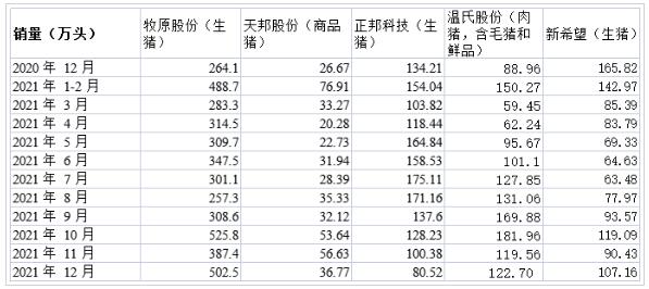 五大上市豬企2021年生豬銷量簡況