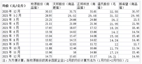 五大上市豬企2021年商品豬均價簡況