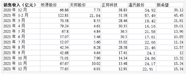 12月收入:牧原股份上漲,新希望持平,其余三家下降