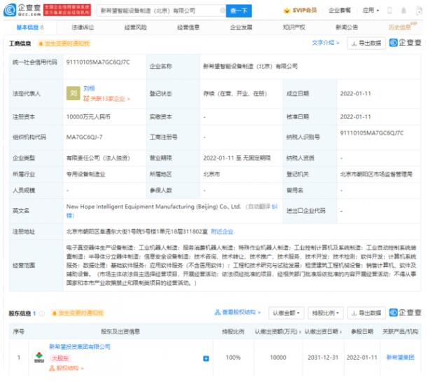 注冊資本1億元!新希望投資成立智能設備制造公司