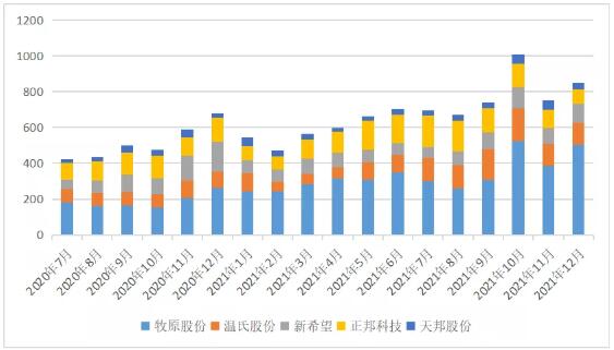 圖表:5大上市豬企月度出欄量(單位:萬頭)數(shù)據(jù)來源:上市公司公告,光大期貨研究所