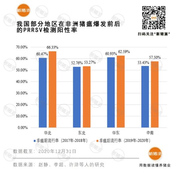 而實(shí)際上,非瘟的爆發(fā)加重了藍(lán)耳病的流行,哈爾濱獸醫(yī)研究所等單位聯(lián)合發(fā)表的一篇論文指出,非瘟后,我國各地藍(lán)耳病病毒(PRRSV)檢測(cè)陽性率平均上漲3%。非瘟常態(tài)化下,做好藍(lán)耳病的監(jiān)測(cè)和清除已刻不容緩。