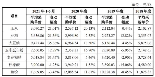 上文提到,公司主要原材料是玉米、豆粕、大豆油、魚(yú)粉等原料,報(bào)告期內(nèi)的直接材料成本占主營(yíng)業(yè)務(wù)成本的比例均在70%以上。受天氣、市場(chǎng)經(jīng)濟(jì)、新冠肺炎疫情等不確定因素影響,公司原材料采購(gòu)單價(jià)總體呈現(xiàn)出波動(dòng)上升的趨勢(shì),特別是在2020年及2021年上半年,其原材料中的玉米、豆粕、大豆油、玉米蛋白粉、麥芽糊精采購(gòu)單價(jià)均呈現(xiàn)較大幅度的上漲。