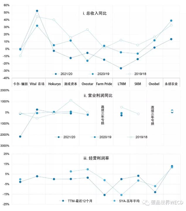 新冠疫情大流行以來,全球蛋雞生產(chǎn)上市企業(yè)前十強中,多數(shù)企業(yè)在2021/20年度總收入同比出現(xiàn)負(fù)增長,較疫情前的2019年和2018年均出現(xiàn)明顯下降;營業(yè)利潤、經(jīng)營利潤率也出現(xiàn)類似特征但較營收下降幅度不太明顯,連續(xù)3年虧損的Farm Pride食品公司、Ovobel 食品公司同期虧損幅度進(jìn)一步加大;比較來看,另外10家上市企業(yè)2021/20年度的總收入、營業(yè)利潤、經(jīng)營利潤率波動幅度整體不太明顯。