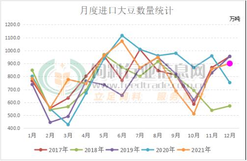 從中國海關(guān)統(tǒng)計數(shù)據(jù)顯示,2021年大豆進(jìn)口9651.8萬噸,占進(jìn)口總量的58.6%。相較2020年的10031.5萬噸減少3.8%。