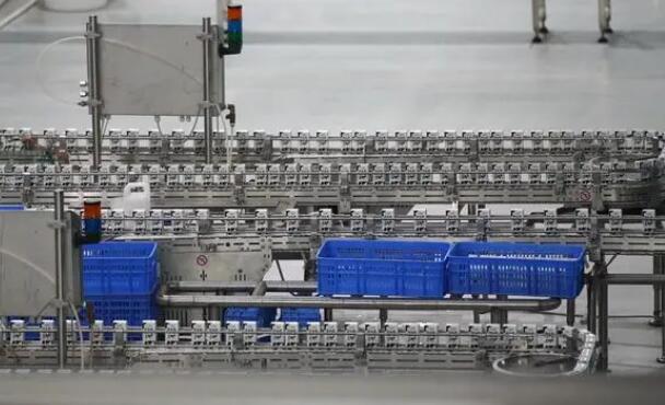 在呼圖壁種牛場(chǎng)下游企業(yè)車(chē)間里,剛灌裝的盒裝牛奶正被送去包裝。(新華社記者 張嘯誠(chéng) 攝)