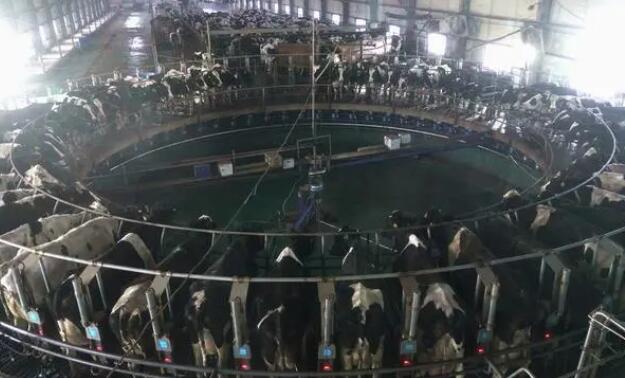新疆呼圖壁種牛場(chǎng)的一間擠奶大廳里,奶牛整齊排列在轉(zhuǎn)盤(pán)式擠奶機(jī)上擠奶。(新華社記者張嘯誠(chéng) 攝)