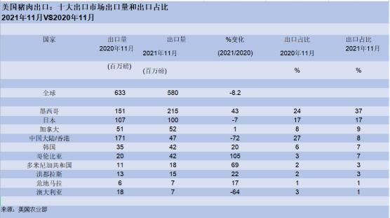 中國海關(guān)數(shù)據(jù)顯示,2021年1月至11月豬肉進口量同比下降近12%。按出口國劃分的進口明細顯示,西半球國家占下降幅度的最大份額:中國對美國豬肉的進口量與2020年同期相比下降了近41%。