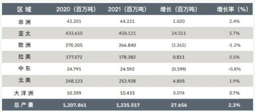 美國仍穩(wěn)居第二,產(chǎn)量為2.32億噸,同比增長2.1%;