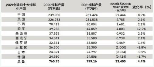 全球前十大生產(chǎn)國飼料產(chǎn)量共計(jì)7.99億噸,同比去年增長4.4%,中國仍然是全球最大的飼料生產(chǎn)國,其產(chǎn)量為2.61億噸,而且實(shí)現(xiàn)了2020年以來最大的增長;