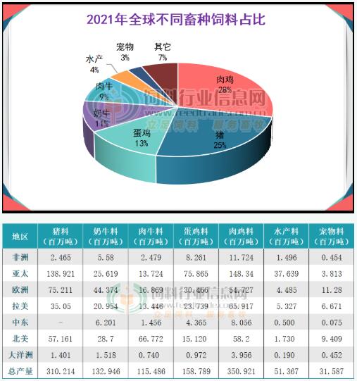 產(chǎn)量最高的三個(gè)區(qū)域仍然是亞太、歐洲和北美,產(chǎn)量分別為4.58億噸、2.67億噸和2.53億噸,其中亞太地區(qū)增長量最大,同比去年增長5.7%,這不僅僅由于全球前十大飼料生產(chǎn)國中國、印度、日本均在亞太地區(qū),而且中國和印度增長之快;其次歐洲降幅最大,達(dá)1.2%,主要因?yàn)榉俏?、原料成本高、終端產(chǎn)品價(jià)格低迷、反芻飼料產(chǎn)量下降以及新冠等因素的影響。