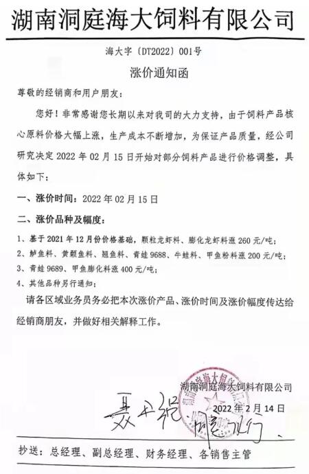 這是進(jìn)入2022年后第二輪大漲價(jià)。今年華中地區(qū)第一輪漲價(jià)是從1月6日起直至1月25日,長(zhǎng)達(dá)20天時(shí)間里,海大、通威、新希望、大北農(nóng)、澳華、湘大等飼料巨頭多個(gè)子公司均漲價(jià),當(dāng)時(shí)漲價(jià)主要品種為蝦蟹料,漲幅為200元/噸。