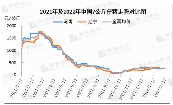 1、年初仔豬價(jià)格漲跌不一 據(jù)卓創(chuàng)資訊數(shù)據(jù)監(jiān)測(cè),近期仔豬市場(chǎng)仍呈整體震蕩下行走勢(shì)。從圖1來(lái)看,截至2022年2月17日全國(guó)7公斤外三元仔豬出欄均價(jià)為250.00元/頭,環(huán)比跌幅1.07%。同比跌幅83.87%。截至17日仔豬最低價(jià)為遼寧地區(qū)244.80元/頭,東北等地區(qū)受豬價(jià)走勢(shì)影響補(bǔ)欄積極性較差,仔豬價(jià)格繼續(xù)下滑;仔豬最高價(jià)為河南地區(qū)285.00元/頭,華中局部地區(qū)補(bǔ)欄情緒略微提升,帶動(dòng)仔豬價(jià)格小幅上漲。當(dāng)下養(yǎng)殖端補(bǔ)欄情緒復(fù)雜,觀望情緒較重,整體仔豬市場(chǎng)成交依舊寡淡。