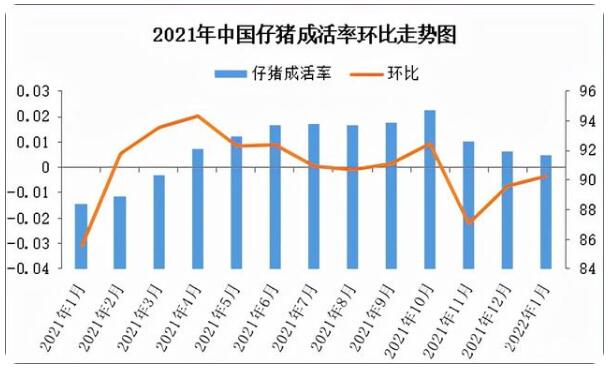 2、仔豬成活率略微下降 從圖2來(lái)看,季節(jié)性影響對(duì)仔豬成活率較為顯著。截至2022年1月份仔豬成活率達(dá)91.64%,環(huán)比下降0.3個(gè)百分點(diǎn),同比上漲3.25個(gè)百分點(diǎn)。反映當(dāng)下受天氣降溫及常規(guī)疫病等影響,雖仔豬成活率小幅下降,但整體并未產(chǎn)生較大影響,仔豬成活率走勢(shì)逐漸恢復(fù)正常水平。