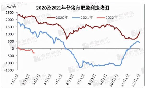 3、2月仔豬育肥盈利破“0”下行 據(jù)卓創(chuàng)資訊數(shù)據(jù)監(jiān)測(cè),從圖3來(lái)看2022仔豬育肥盈利整體呈下行走勢(shì)。從1月初最高點(diǎn)仔豬育肥盈利為92.38元/頭,最低點(diǎn)為2月14日-313.70元/頭。雖年初春節(jié)備貨提振,但力度較有限,豬價(jià)下滑帶動(dòng)育肥盈利值下滑。隨小體重生豬市場(chǎng)出欄較多,及飼料原料成本小幅上漲,加快仔豬育肥盈利虧損。