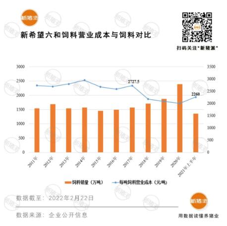 得益于強(qiáng)勁的采購(gòu)力,新希望六和飼料成本總體控制較好。2017年-2021年上半年,其每噸飼料營(yíng)業(yè)成本隨著飼料銷(xiāo)量上漲,反而總體呈下降趨勢(shì)。