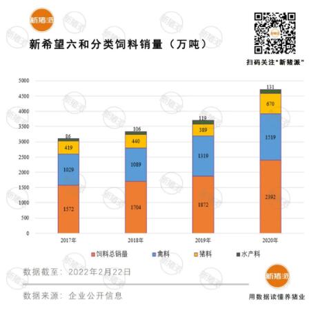 以飼料業(yè)務(wù)起家發(fā)展至今,新希望六和已走過(guò)了24年歷史,飼料銷(xiāo)量從1998年的16.32萬(wàn)噸增加至2021年的2800萬(wàn)噸,位居全球第一,年均復(fù)合增長(zhǎng)率超過(guò)20%。