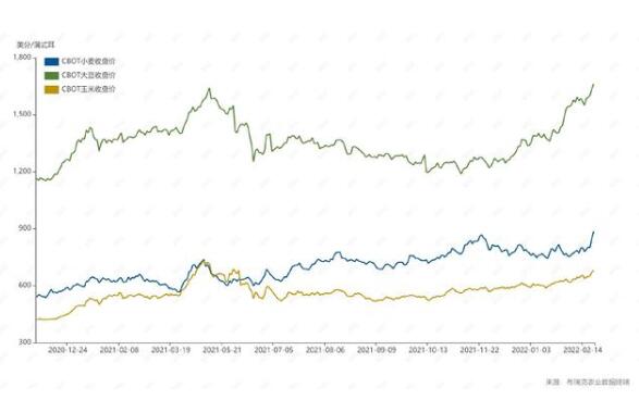 2月23日,CBOT小麥期貨上漲至每蒲式耳8.76美元,創(chuàng)下2012年12月以來(lái)的最高水平;大豆期貨最高上漲至每蒲式耳16.75美元,達(dá)到9年來(lái)的高位;玉米期貨市場(chǎng)收盤(pán)上漲,其中5月期約創(chuàng)下近十年來(lái)的最高水平。