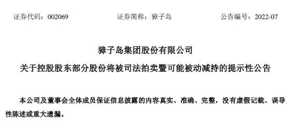 2月18日,獐子島發(fā)布公告,獲悉上述股東收到大連中院出具的執(zhí)行裁定書,案件進(jìn)入執(zhí)行程序,三名股東作為被執(zhí)行人,未能履行還款義務(wù),其被凍結(jié)證券應(yīng)當(dāng)予以變價(jià),并以變價(jià)所得清償被執(zhí)行人結(jié)欠之債務(wù)。其中,控股股東獐子島投資發(fā)展中心持有的近1.1億股將被拍賣、變賣。