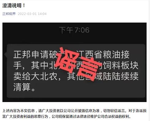 3月1日,正邦集團發(fā)布澄清說明稱,關(guān)于公司“申請破產(chǎn)”等相關(guān)內(nèi)容為不實信息,請廣大投資者以公司公開披露信息為準,切勿輕信謠言。對于造謠損害廣大投資者利益的惡意行為,公司將保留通過法律途徑維護公司合法權(quán)益的權(quán)利。