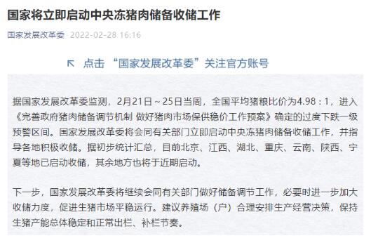 發(fā)改委2月28日發(fā)布消息,據(jù)國家發(fā)展改革委監(jiān)測,2月21日~25日當(dāng)周,全國平均豬糧比價為4.98∶1,進(jìn)入《完善政府豬肉儲備調(diào)節(jié)機(jī)制 做好豬肉市場保供穩(wěn)價工作預(yù)案》確定的過度下跌一級預(yù)警區(qū)間。國家發(fā)展改革委將會同有關(guān)部門立即啟動中央凍豬肉儲備收儲工作,并指導(dǎo)各地積極收儲。據(jù)初步統(tǒng)計匯總,目前北京、江西、湖北、重慶、云南、陜西、寧夏等地已啟動收儲,其余地方也將于近期啟動。