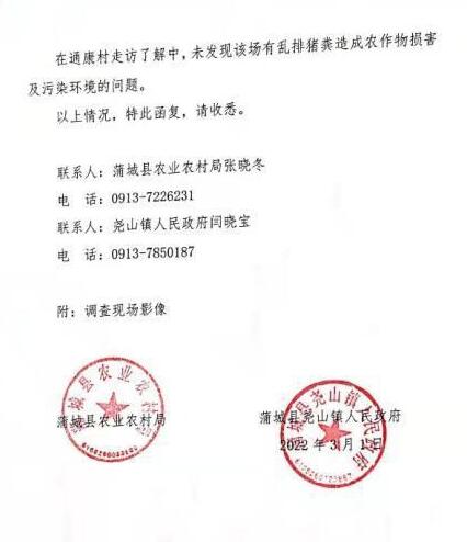 3月3日,蒲城縣農(nóng)業(yè)農(nóng)村局、蒲城縣堯山鎮(zhèn)人民政府回函稱,“蒲城縣堯山鎮(zhèn)通康村河南牧原豬場”系蒲城牧原農(nóng)牧有限公司第十二分場,經(jīng)走訪了解,未發(fā)現(xiàn)該場有亂排豬糞造成農(nóng)作物損害及污染環(huán)境的問題。