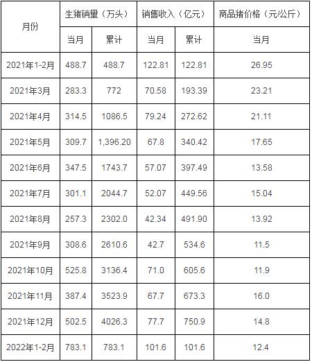 2022年1-2月份,公司商品豬銷售均價(jià)12.38元/公斤,比2021年12月份下降16.07%。