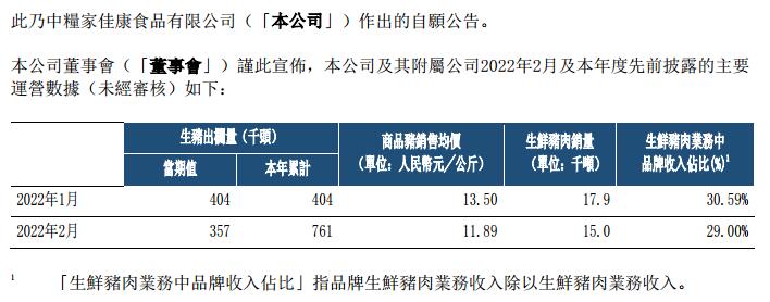 中糧家佳康3月9日公布2022年2月運營快報。公司2月生豬出欄量35.7萬頭;商品豬銷售均價人民幣11.89元/公斤,生鮮豬肉銷量1.50萬噸,生鮮豬肉業(yè)務中品牌收入占比為29.00%。