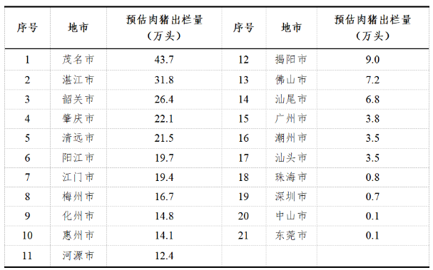 廣東省各地市肉豬出欄量表