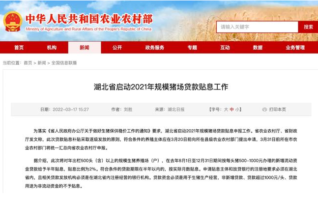 去年下半年以來,豬肉價格持續(xù)下跌,養(yǎng)豬企業(yè)普遍出現(xiàn)虧損。為幫助企業(yè)渡過難關(guān),促進(jìn)生豬行業(yè)健康穩(wěn)定發(fā)展,湖北省雙管齊下,在近期開展凍豬肉儲備收儲工作后,此次又及時啟動貸款貼息工作。