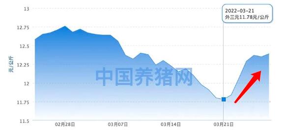 中國養(yǎng)豬網最新數據顯示,3月21日至3月27日,生豬(外三元)價格從11.78元/公斤漲至12.39元/公斤,漲幅超過5%。