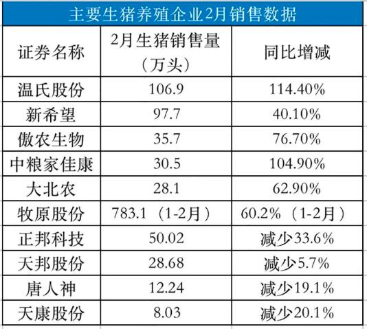 數據顯示,溫氏股份、新希望、傲農生物、中糧家佳康、大北農等企業(yè)2月出欄量同比正增長。其中,溫氏股份出欄106.9萬頭,同比增長114.4%;新希望出欄97.7萬頭,同比增長40.1%;傲農生物出欄35.7萬頭,同比增長76.7%;中糧家佳康出欄30.5萬頭,同比增長104.9%;大北農出欄28.1萬頭,同比增長62.9%。另外,牧原股份1月-2月出欄量為783.1萬頭,同比增長60.2%。